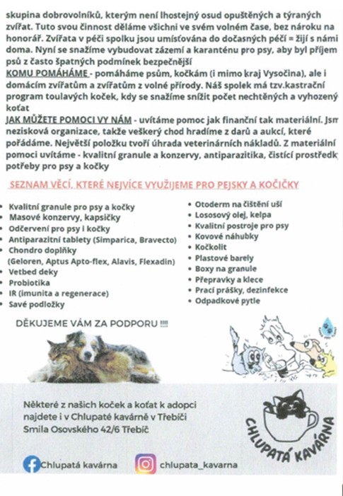 Pomáhejte spolu s námi zachráněným tlapkám - pejskům a kočičkám. Věci ( viz. přiložený seznam) můžete přinášet do svých kmenových tříd do úterý 19.12. 2023, ve středu 20.12. již budou převezeny k pejskům a kočičkám.