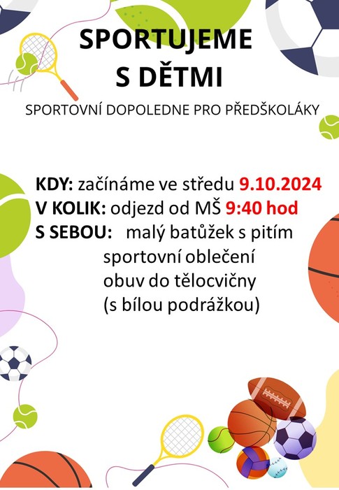 Jako každým rokem budeme jezdit s předškoláky do tenisové haly u nemocnice v Třebíči. Děti si procvičí základy tenisu, fotbalu, košíkové...seznámí se s různým sportovním náčiním, zahrají si pohybové hry, procvičí si svoji obratnost a hrubou motoriku. Bližší informace naleznete v přiloženém letáku.