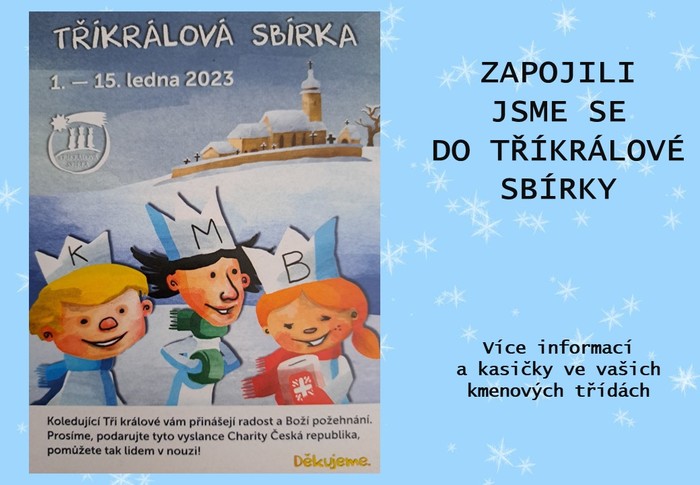 Zapojili jsme se do Tříkrálové sbírky, která probíhá od 3.1.2023 do 15.1.2023. Bližší informace a kasičky jsou k dispozici ve vašich kmenových třídách.