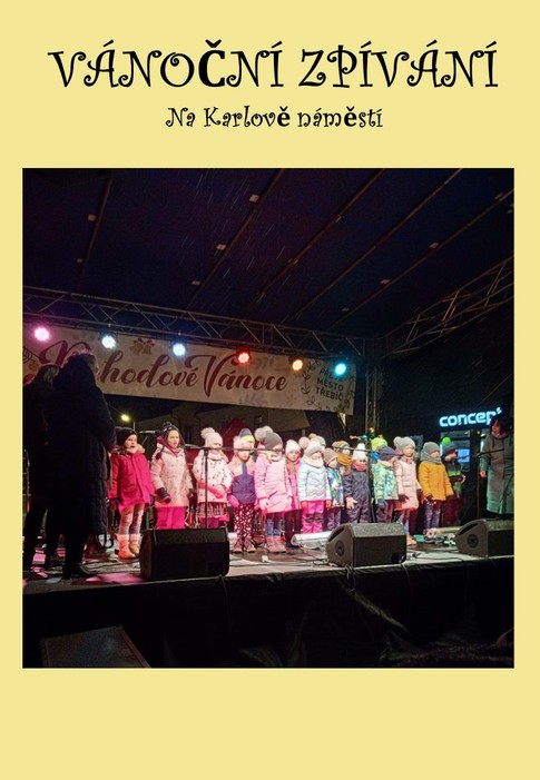 Vybraní zpěváčci ze třídy Kuřátek, Motýlků a Rybiček vystoupili v pondělí na Karlově náměstí v Třebíči, aby zazpívali vánoční koledy a písničky. Vystoupení se všem moc podařilo a doufáme, že i vás, kteří jste se přišli podívat, příjemně naladilo do předvánoční atmosféry. Děkujeme všem, kteří se na akci podíleli!