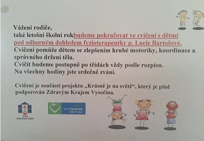 Vážení rodiče, tento rok opět pokračujeme ve zdravém cvičení s p. fyzioterapeutkou Lucií Bartošovou.