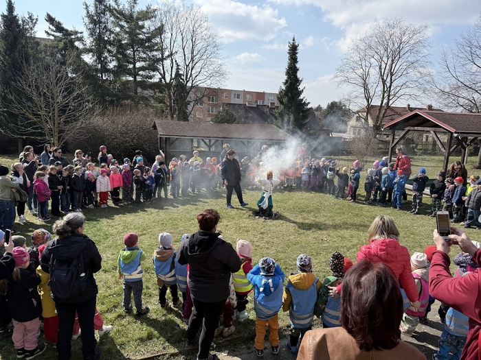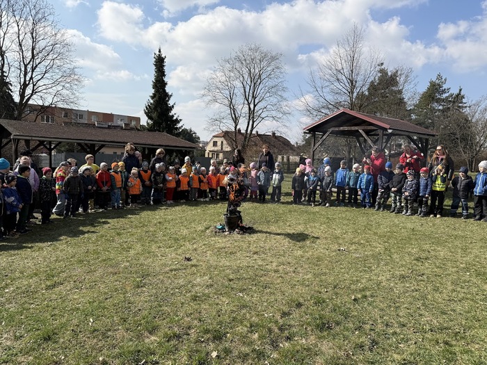 Na zahradě jsme se rozloučili se zimou symbolickým „vynesením“ Moreny. Následovalo její bezpečné spálení pod dohledem dospělých, které pro děti představovalo silný zážitek. Společně jsme tak symbolicky ukončili zimní období a otevřeli dveře jaru.