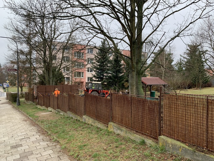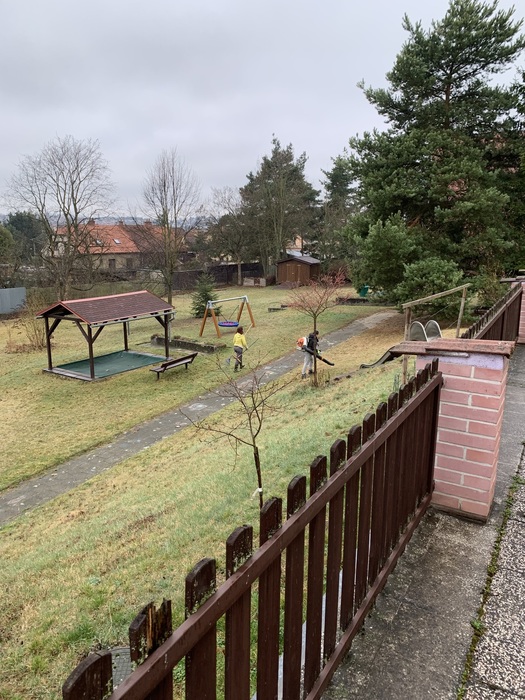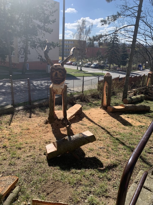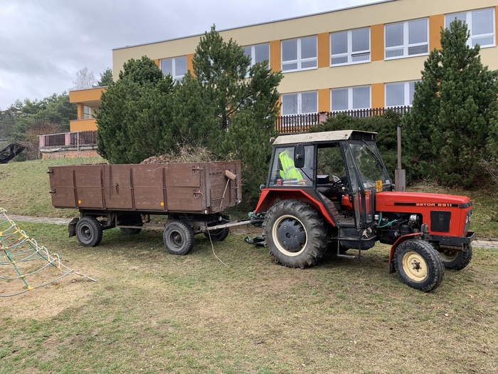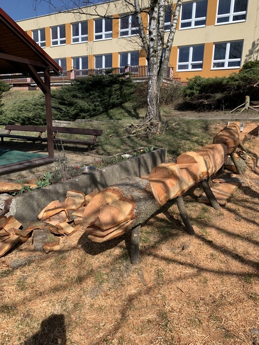 Jarní prořezávání keřů a úklid zahrady jsme také letos přenechali zahradnické firmě. Zahradníci pročistili a odřezali větve v živém plotě, staré suché větve odvezl traktor. Další muži - řezbáři vyřezávaji ze dřeva pro děti různé lavičky, draky dle fantazie.