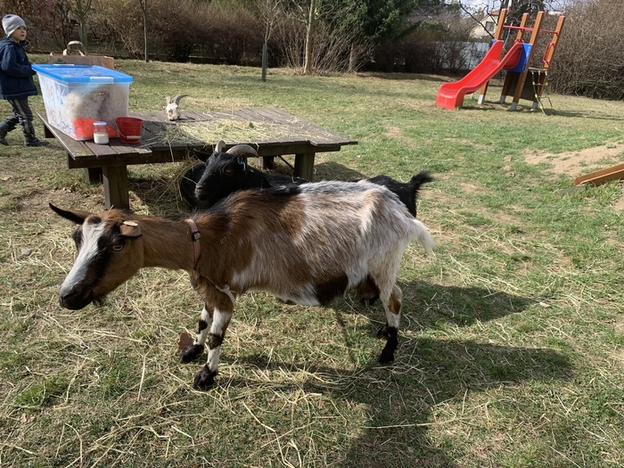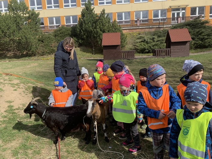 V rámci projektového dne ,,Procházka s kozou " si děti mohly na zahradě prohlédnout a pohladit kozy, seznámit se s jejich životem apod.