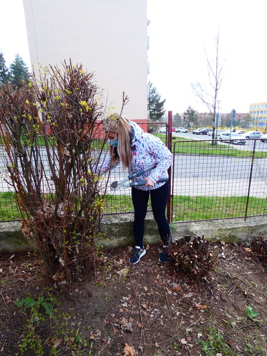 Prořezat stromy a keře v celé zahradě. Poděkování za pročištění, prořezání keřů a stromů patří panu Manovi a jeho pomocníkům.