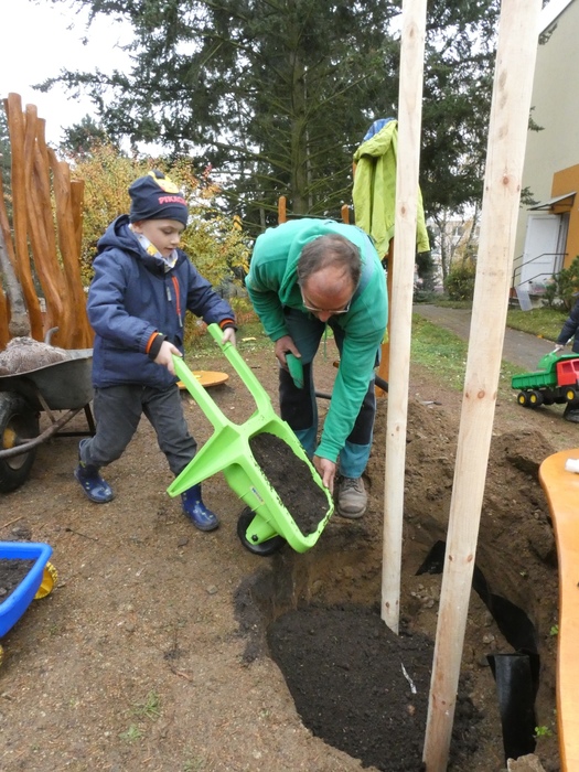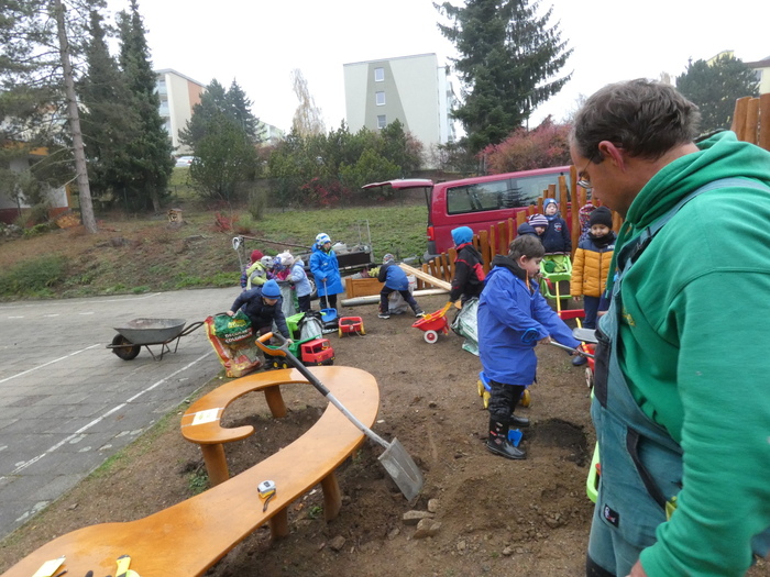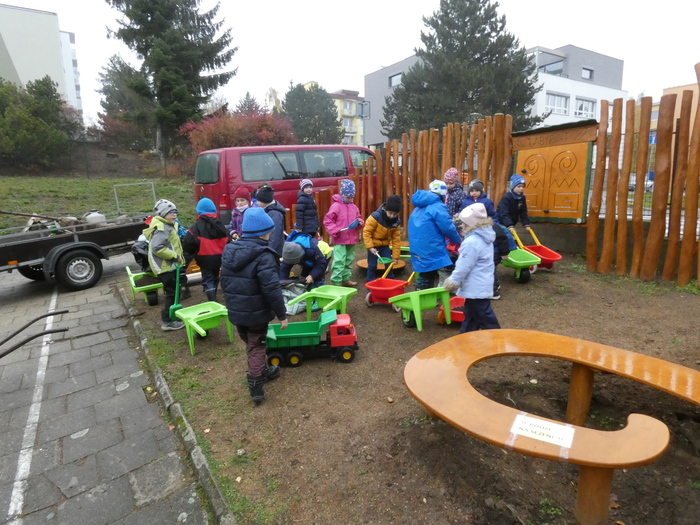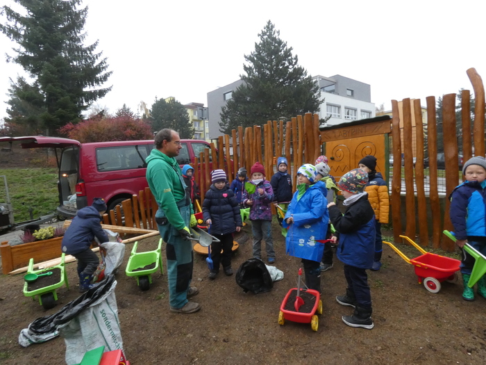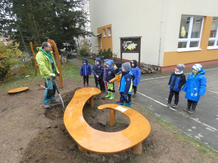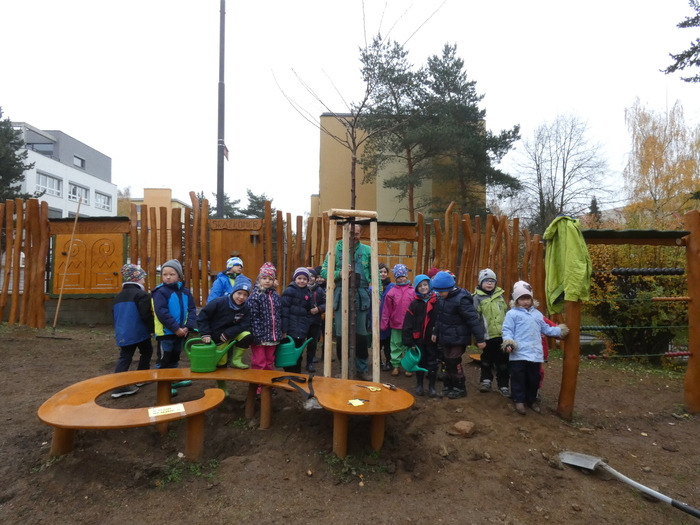 V úterý 14.11. 2019 jsme s dětmi zasadili stromek japonskou třešeň - Sakuru, u vchodu do školky. Děkujeme panu Vejtasovi ze zahradnictví v Jaroměřicich nad Rokytnou za pomoc a pěknou spolupráci při zasazení stromku. Společně s dětmi jsme také do kořenům stromku umístili vzkaz v lahvičce pro další generace. Vzkaz obsahoval nakreslená sluníčka všech pomocníků s datumem a jménem stromku. Radost a nadšení nás při práci neopouštěla, a tak jestě na závěr děti zasely kolem stromku travní semínka.