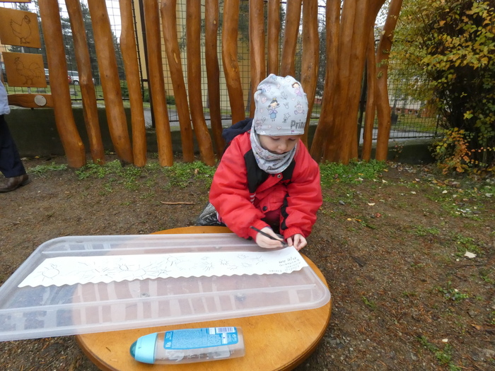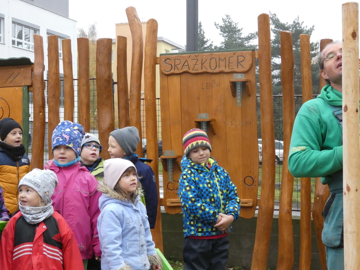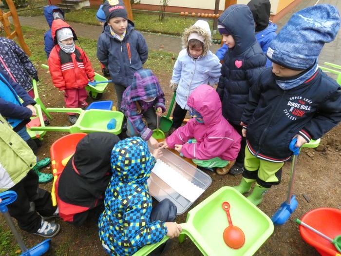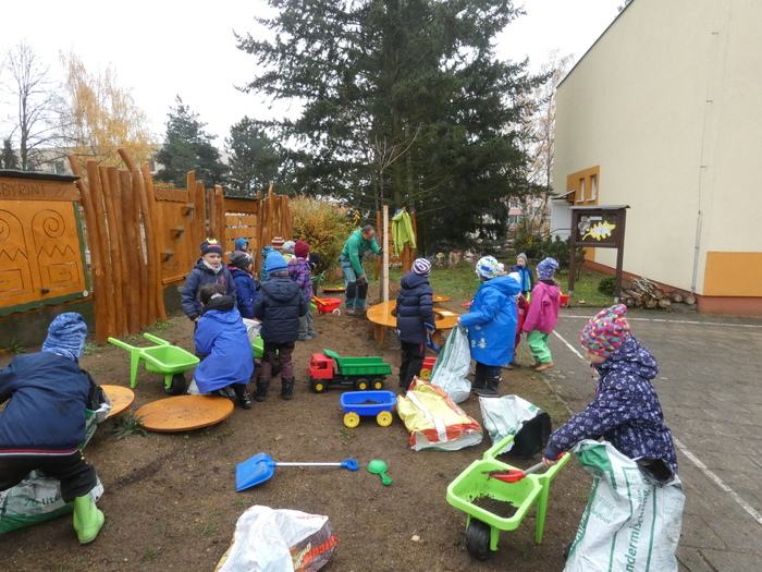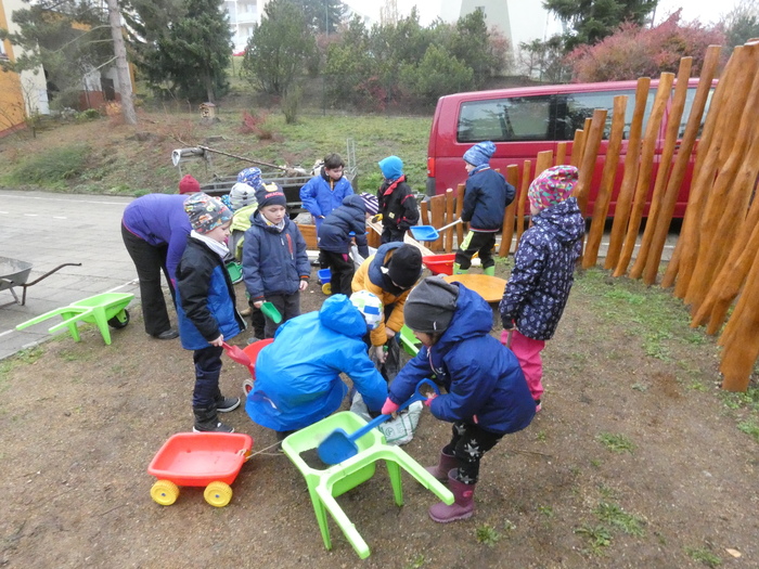 Připravujeme zahradu s dětmi na zimu. Děti pozorují změny v přírodní zahradě. Javory jsou jíž bez listí, v korunách stromů jsou vidět opuštěná ptačí hnízda. Děti pomáhají rozlévat dešťovou vodu ze sudů ke stromům a keřům. Prázdné nádrže ( sudy ) uklízíme ze zahrady.