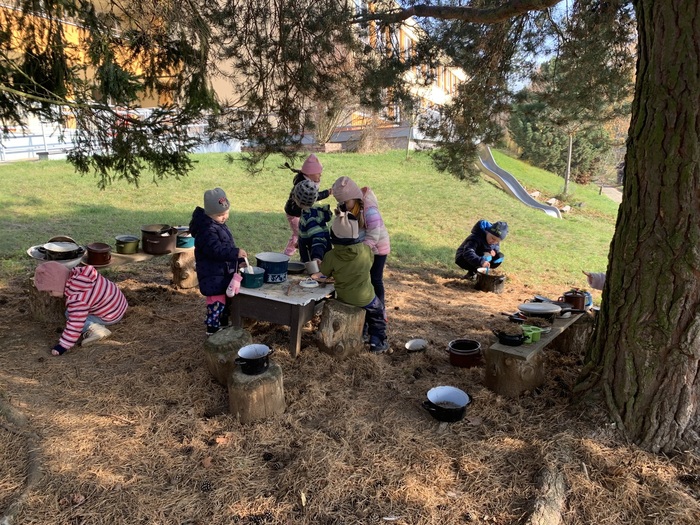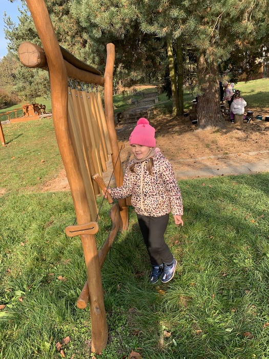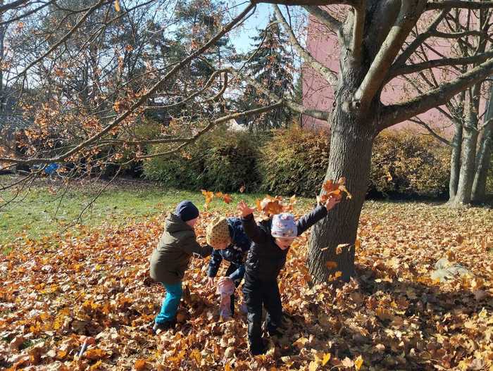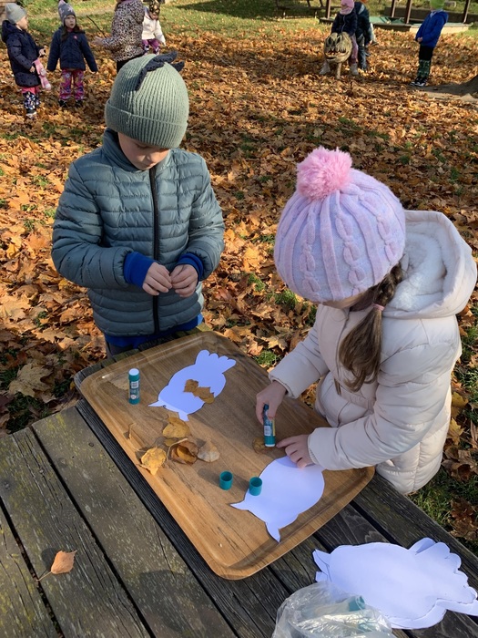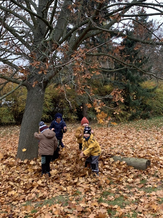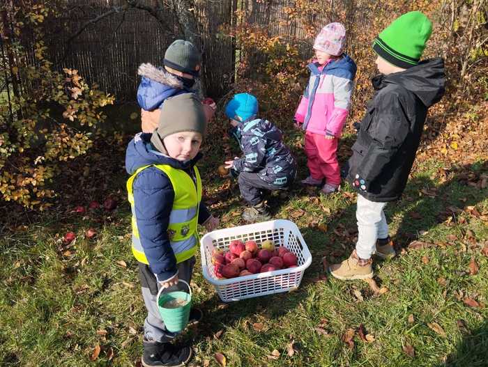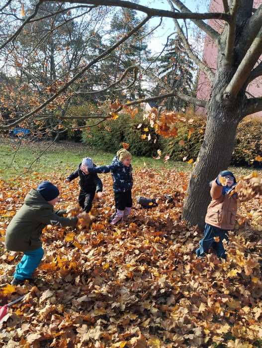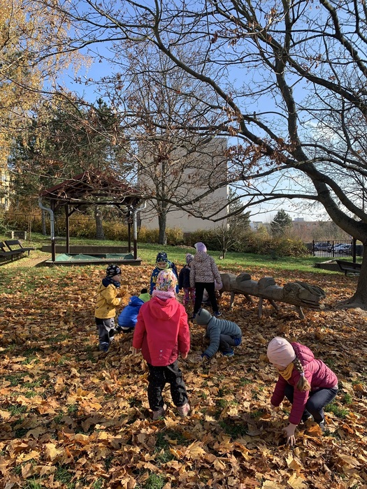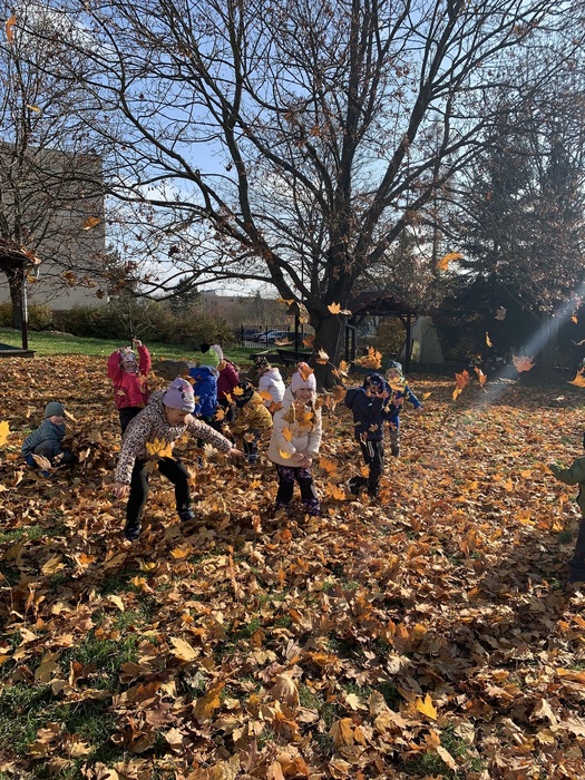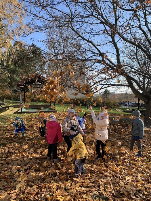 Děti využívaly k volné hře v přírodní zahradě v listopadu listí z javoru, k tvoření soviček z papíru žlutě zbarvené listy břízy, využívaly k volné hře přírodní kuchyńku a přírodní terén zahrady, pozorovali jsme společně opadání listů z javoru a východ slunce. Kamarádi ze 6.třídy Rybiček posbírali poslední úrodu jablíček.