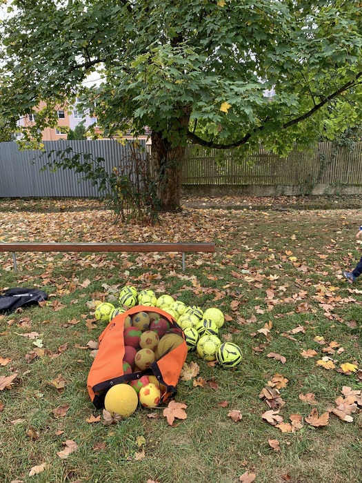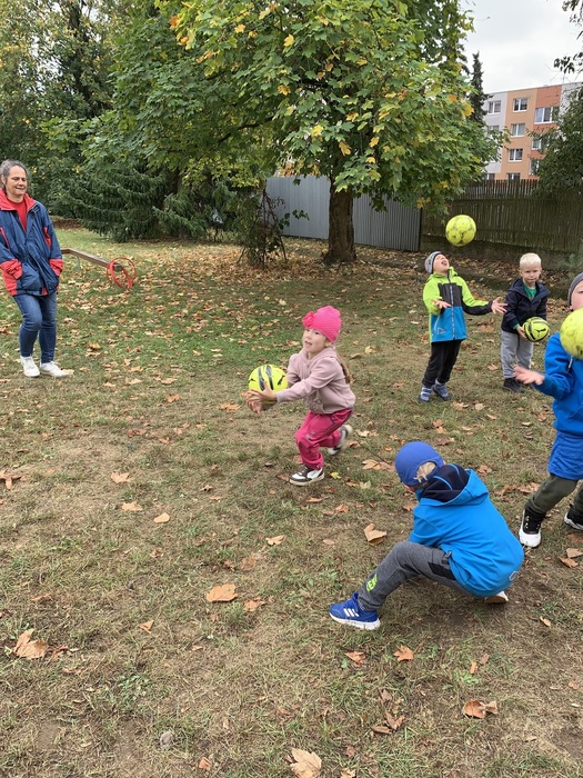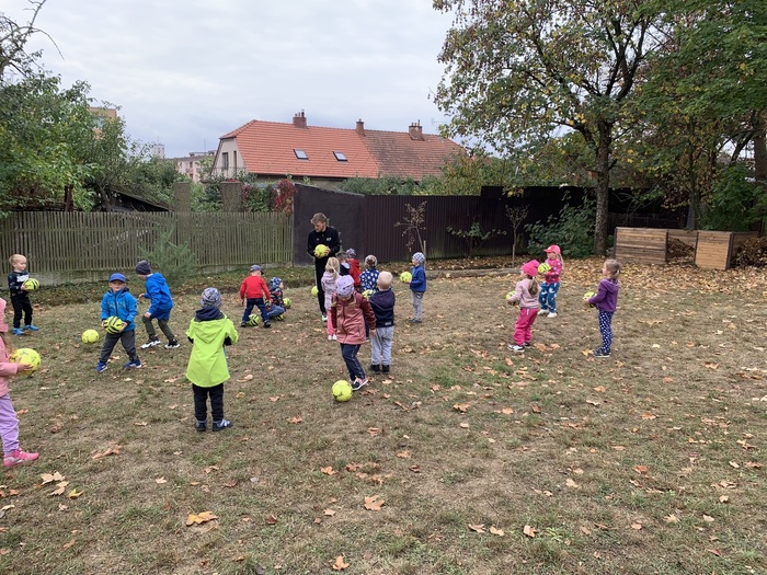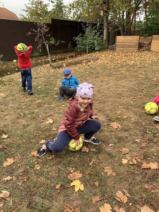 Neobvykle teplé počasí na zahradě jsme opět využili ke sportování a volným hrám. Děti trénovaly v prostorách zahrady pod vedením trenérů fotbalové školičky s míčem. S dětmi jsme pravidelně zalévali mladé smrčky a dolévali pítka pro hmyzáčky a ptáčky( bylo velké sucho).