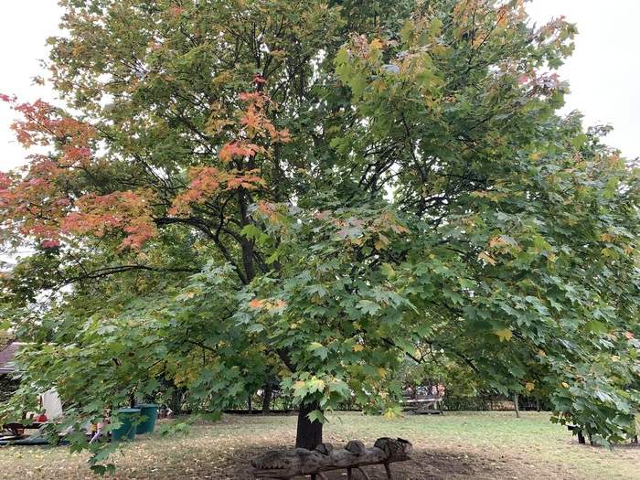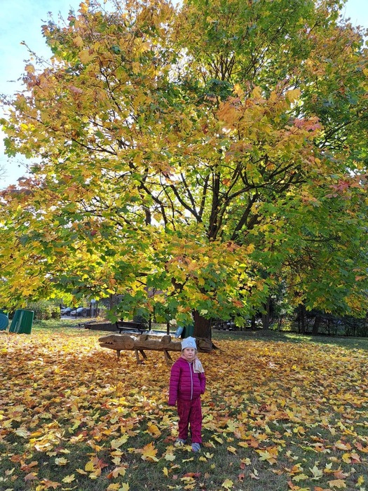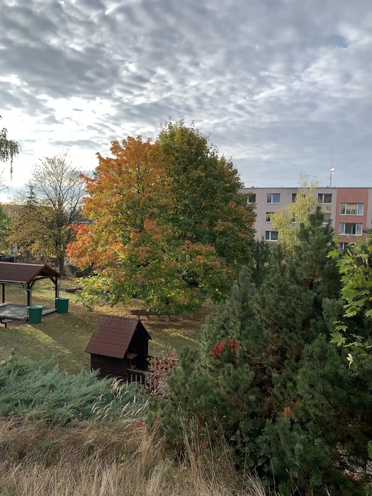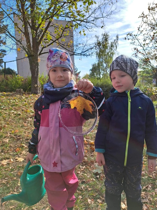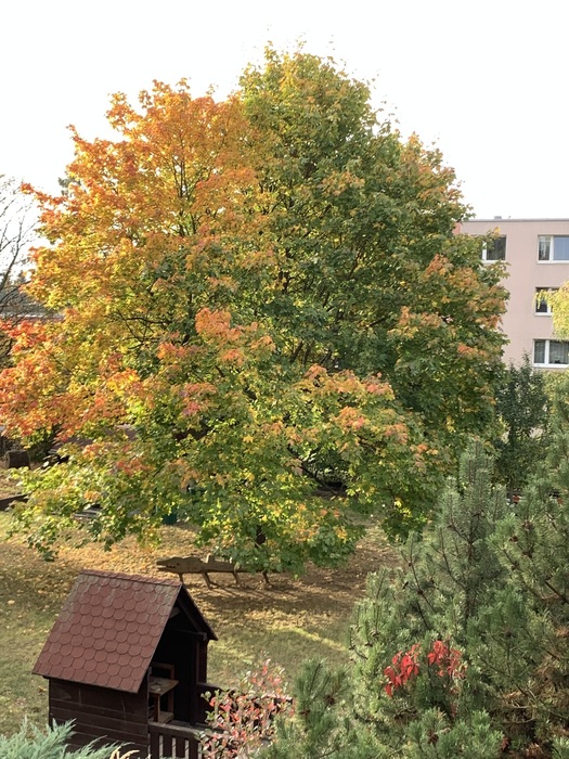 Náš krásný javor uprostřed zahrady se začíná zbarvovat běhěm několika dnů do podzimní nepřeberné palety barev. S dětmi krásu sdílíme a pozorujeme.
