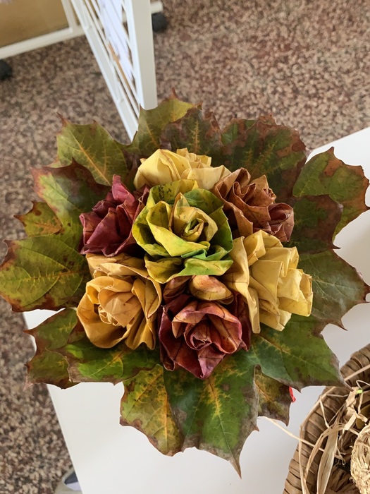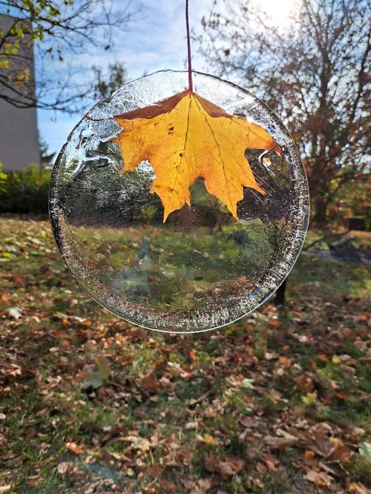 Děti objevily první led v pítku pro ptáčky a hmyzáčky a ve spojení s barvícím se javorovým listem přiroda vytvořila umělěcké dílo.( 18.10.2023)