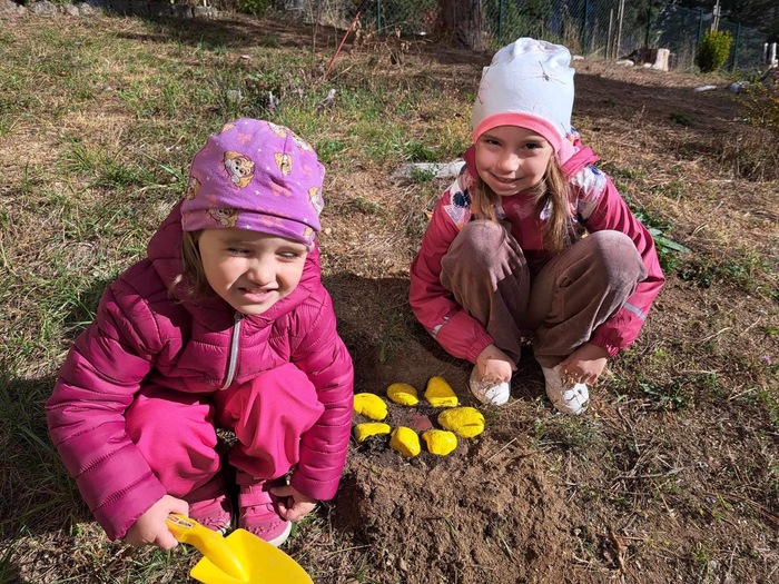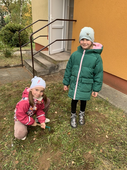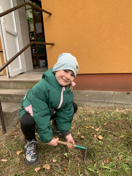 S dětmi jsme zasázeli cibulky tulipánů před zahradní domek a doufáme, že cibulky zimu přežijí. Budeme se těšit až vykvetou na jaře krásné květy tulipánů. Společně jsme uklidili sudy na dešťovou vodu.Vodu jsme rozlili ke stromům a do záhonů.