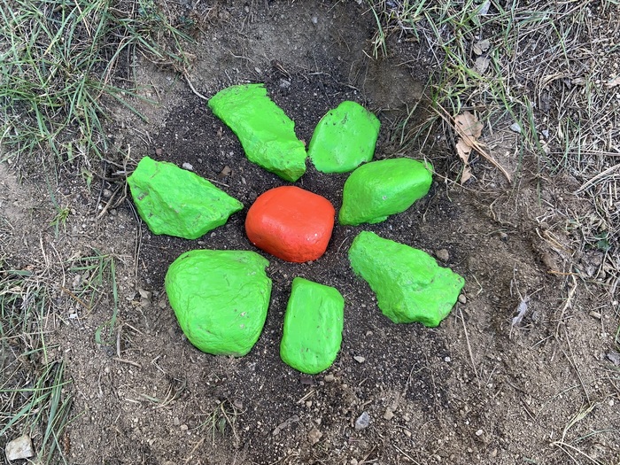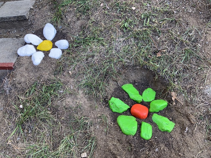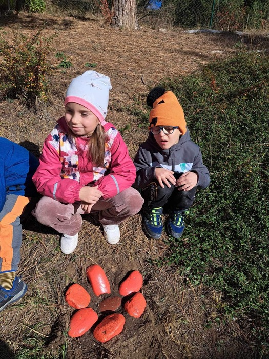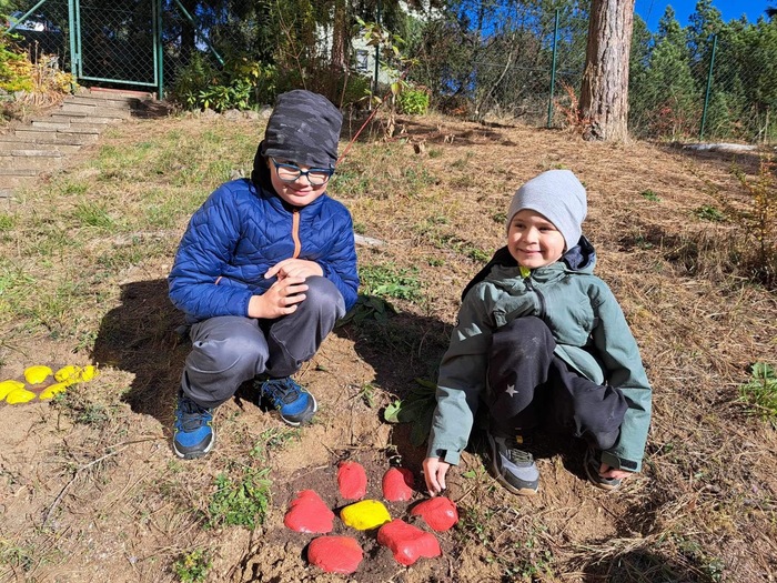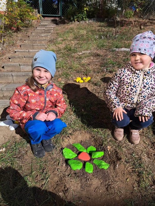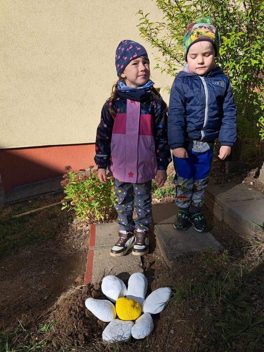 S dětmi jsme ozdobili stráň před školkou barevnými kameny a sestavili kamenné květy. Ještě jednou moc děkujeme za spolupráci paní Vlasákové, která všechny kameny pro nás nabarvila.