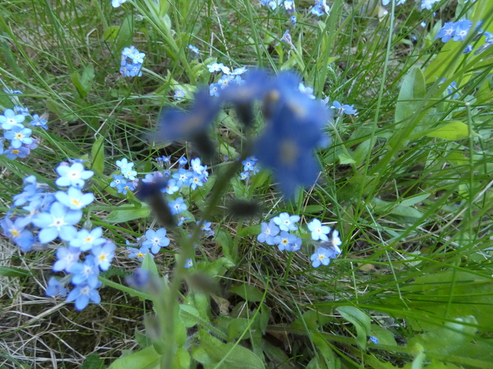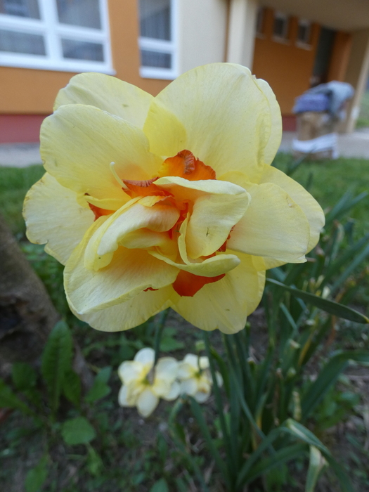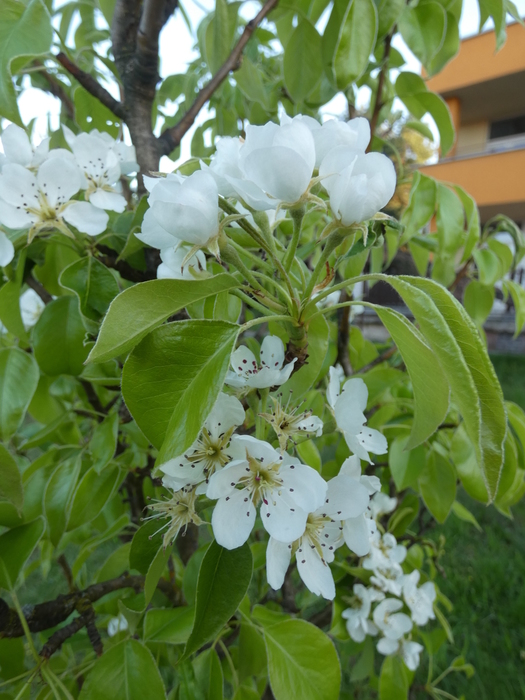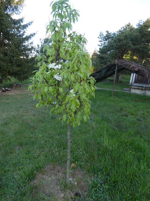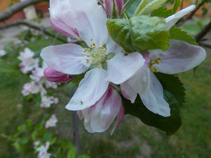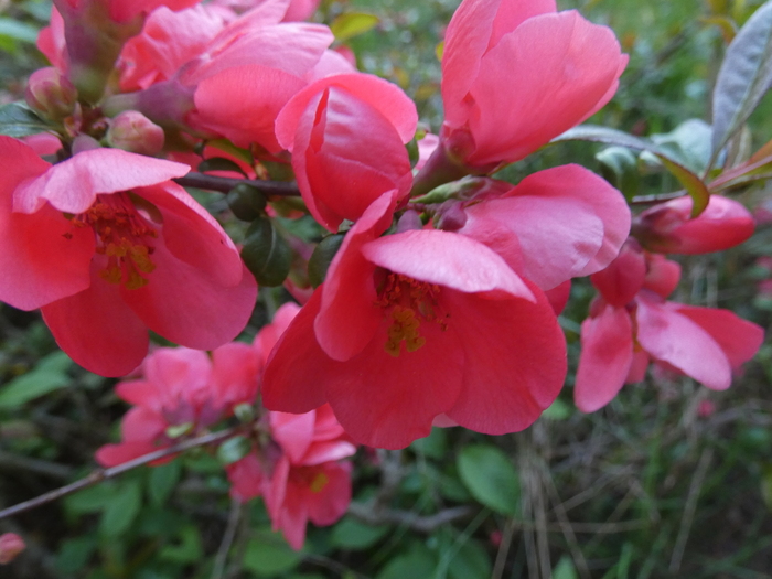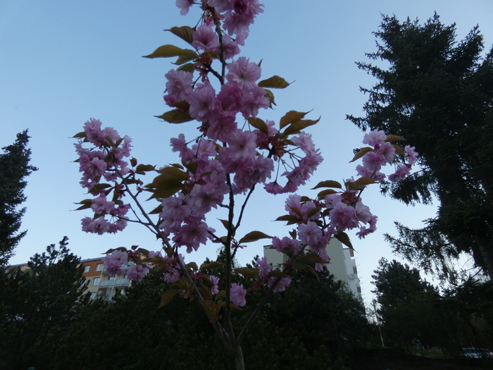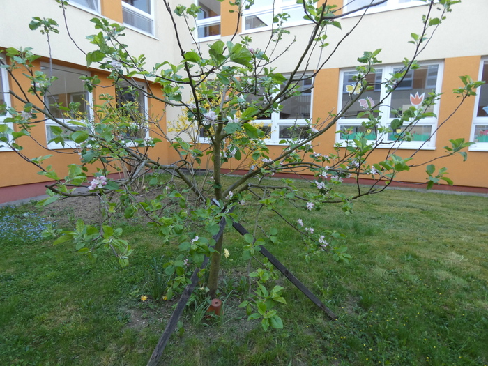 Kdoulovec začíná zdobit zahradu svými úžasnými řůžově červenými květy, kvete hrušeň, třešně Sakury, ještě také narcisky, dokvétají tulipány, kvetou pomněnky, pampelišky a stepní rostliny ve stráni pod terasou.