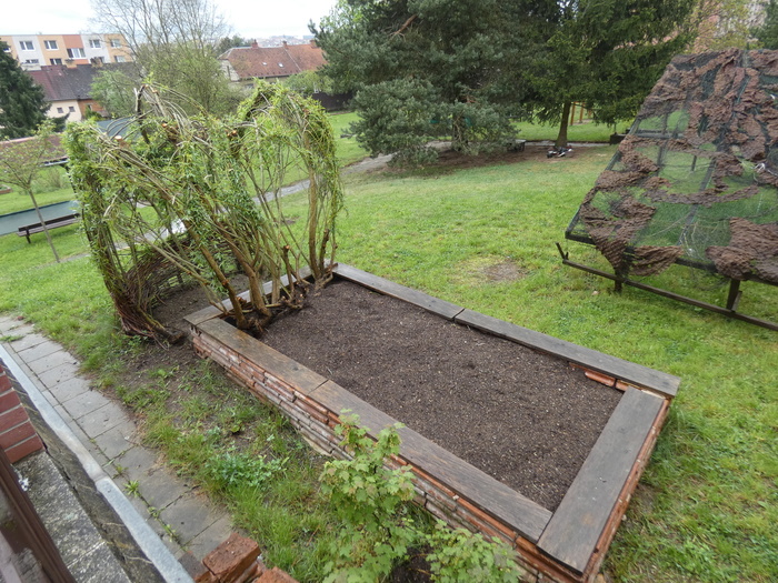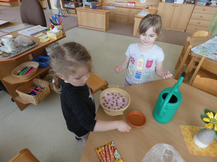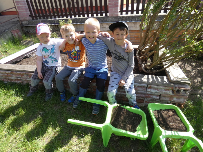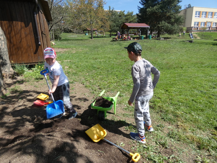 Stromy, keře, květiny, stráně pod terasou už nádherně kvetou. S dětmi obdivujeme jejich krásu. Děti seznamujeme, co všechno rostliny k životu potřebují. Půda je základem pro život rostlin ,keřů i stromů na zahradě. S dětmi se nám podařilo rozvést hlínu z kompostu do vyvýšeného záhonu. Vyvýšený záhonek je připravený k sázení naklíčených luštěnin i sazeniček dýní.