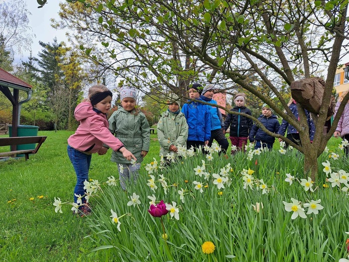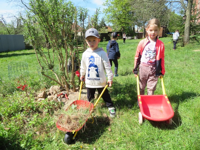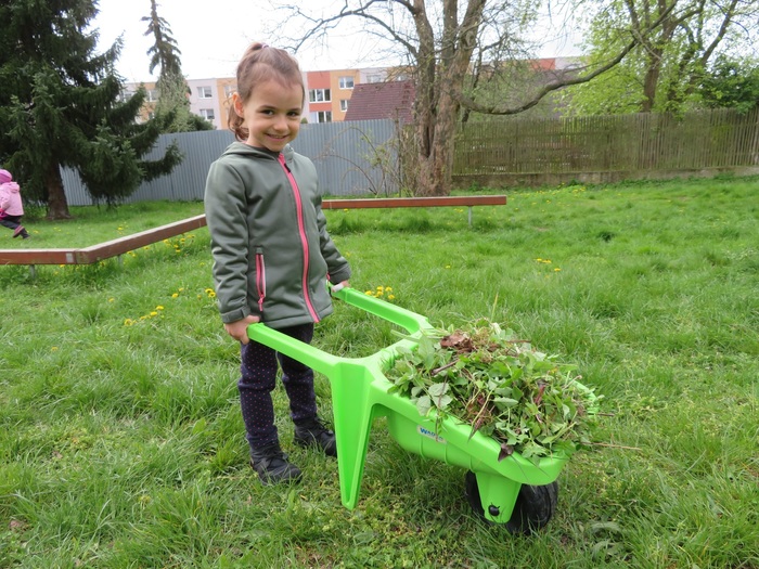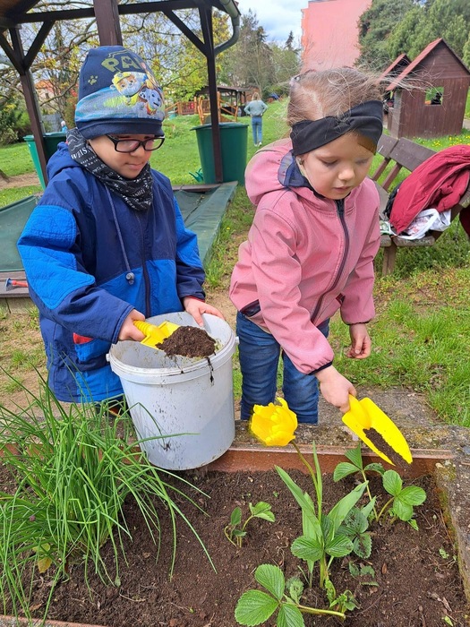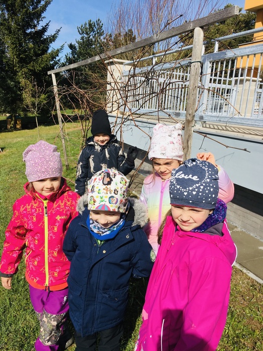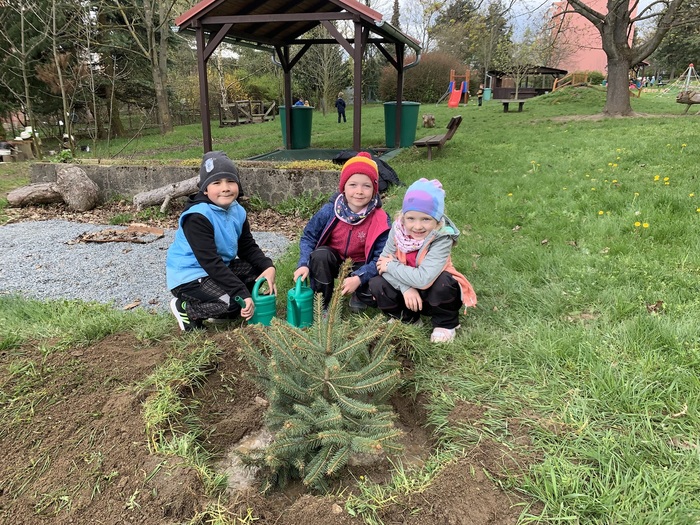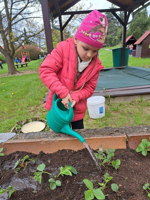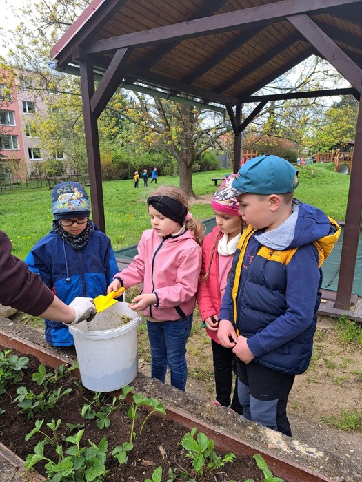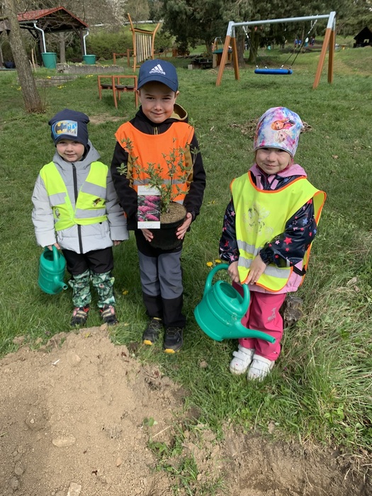 S dětmi jsme začali zahradničit. Společně s dětmi jsme zasadili nový motýlí keř, dva smrky, růži, okrasnou trávu a několik trvalek. Děti se seznamovaly se zahradním nářadím - motykou, rýčem a také s kompostem v rohu zahrady, který je důležitý pro růst stromů a rostlin. Pro nejmenší a menší obyvatele zahrady - hmyz a ptáky jsme obnovili pítko s netřesky a nové pítko jsme s dětmi založili na pařezu naproti zahradnímu domku. Vedle pískoviště jsme vypleli záhonek a přesadili jahody, zasadili dračí vrbu a předpěstovanou kukuřici. Děti s paní učitelkami a asistentkami vyplely a zalily bylinkovou spirálku a motýlí keře. Děti s paní učitelkou Březinovou pomáhaly při jarní práci - ostříhání vinné révy pod terasou. Držte nám palce, ať nám vše vyroste.