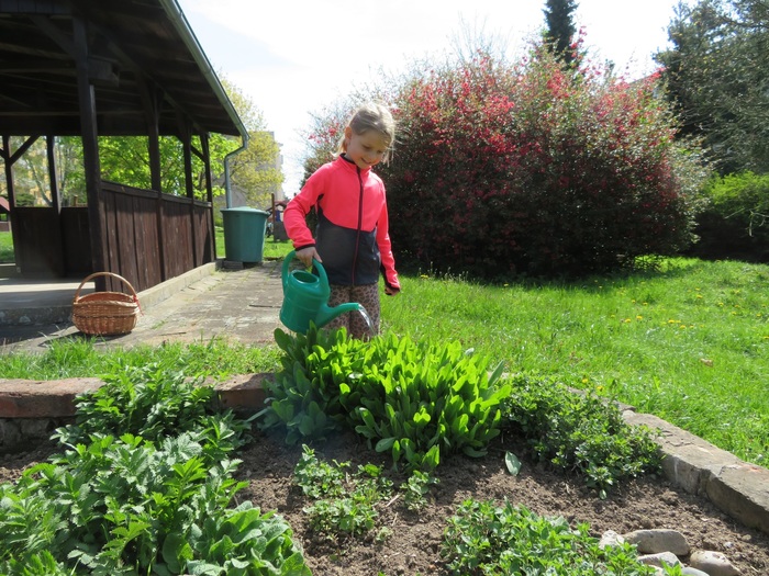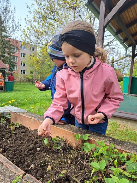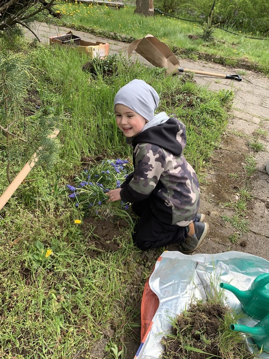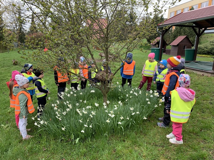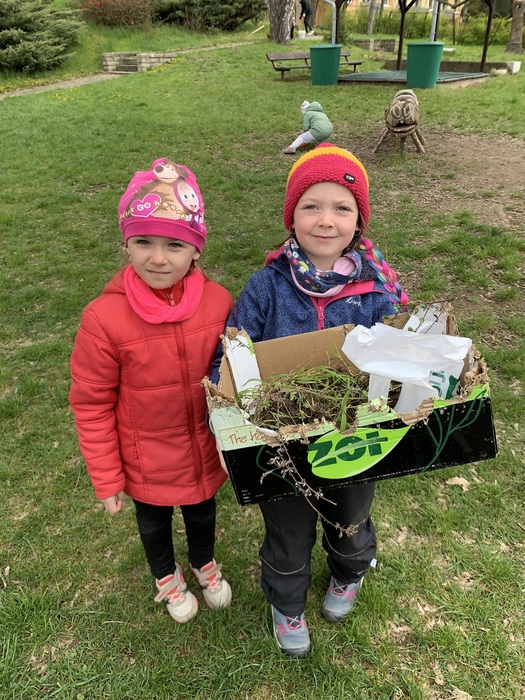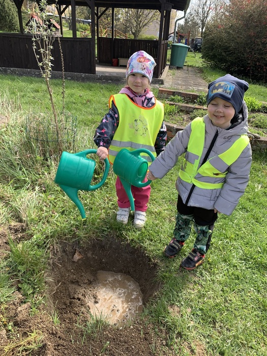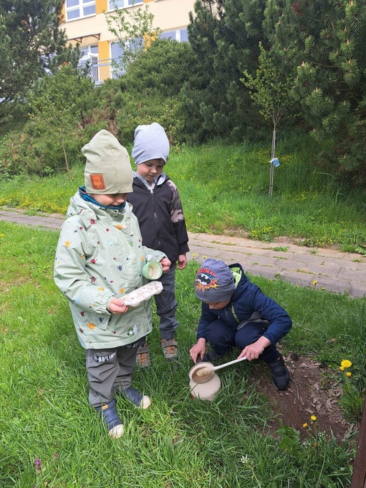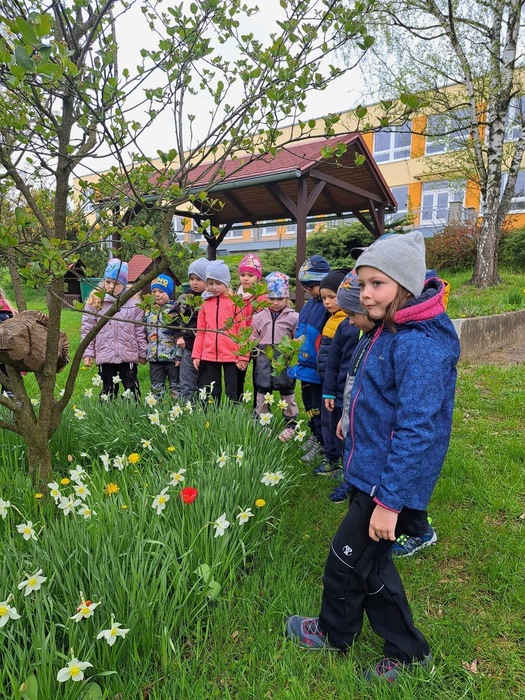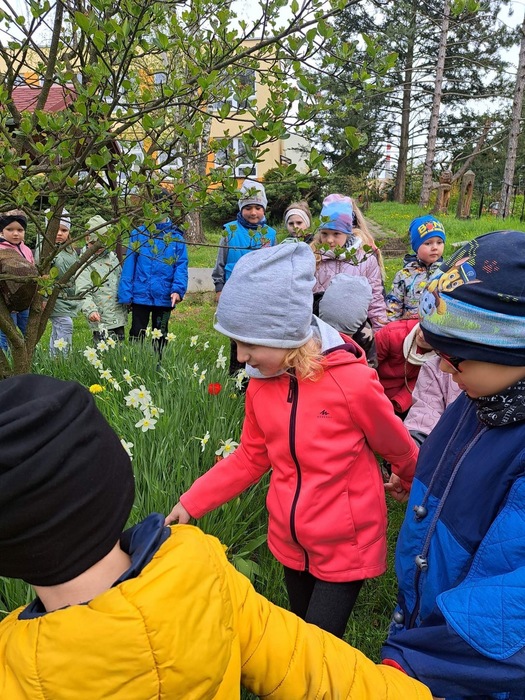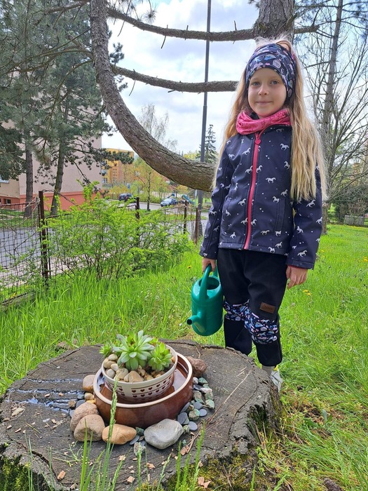 S dětmi jsme začali zahradničit. Společně s dětmi jsme zasadili nový motýlí keř, dva smrky, růži, okrasnou trávu a několik trvalek. Děti se seznamovaly se zahradním nářadím - motykou, rýčem a také s kompostem v rohu zahrady, který je důležitý pro růst stromů a rostlin. Pro nejmenší a menší obyvatele zahrady - hmyz a ptáky jsme obnovili pítko s netřesky a nové pítko jsme s dětmi založili na pařezu naproti zahradnímu domku. Vedle pískoviště jsme vypleli záhonek a přesadili jahody, zasadili dračí vrbu a předpěstovanou kukuřici. Děti s paní učitelkami a asistentkami vyplely a zalily bylinkovou spirálku a motýlí keře. Děti s paní učitelkou Březinovou pomáhaly při jarní práci - ostříhání vinné révy pod terasou. Držte nám palce, ať nám vše vyroste.