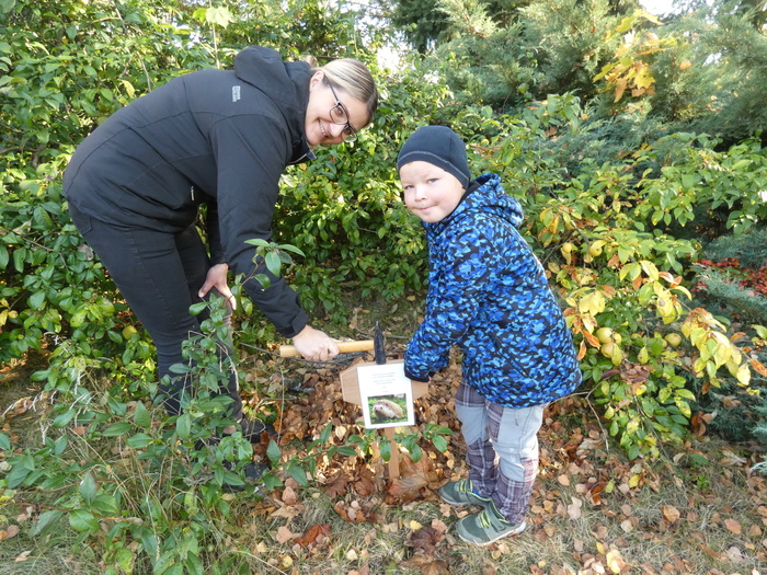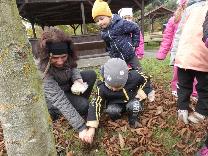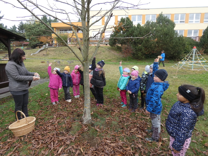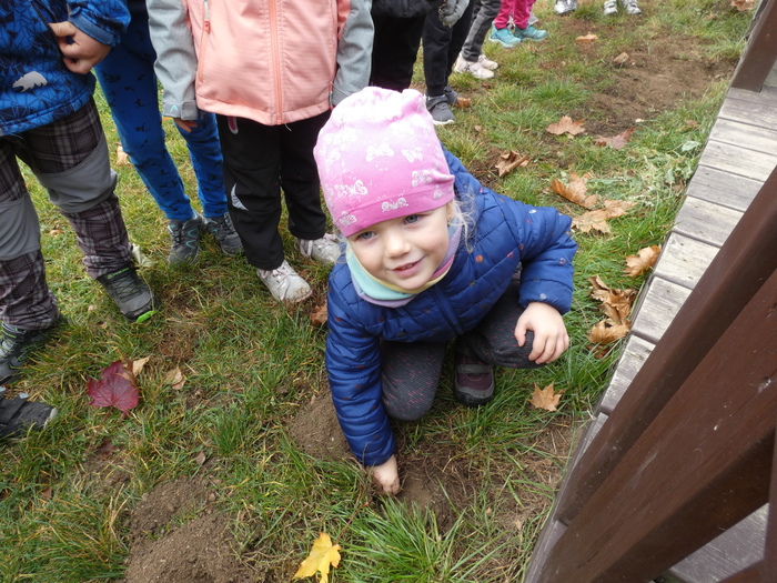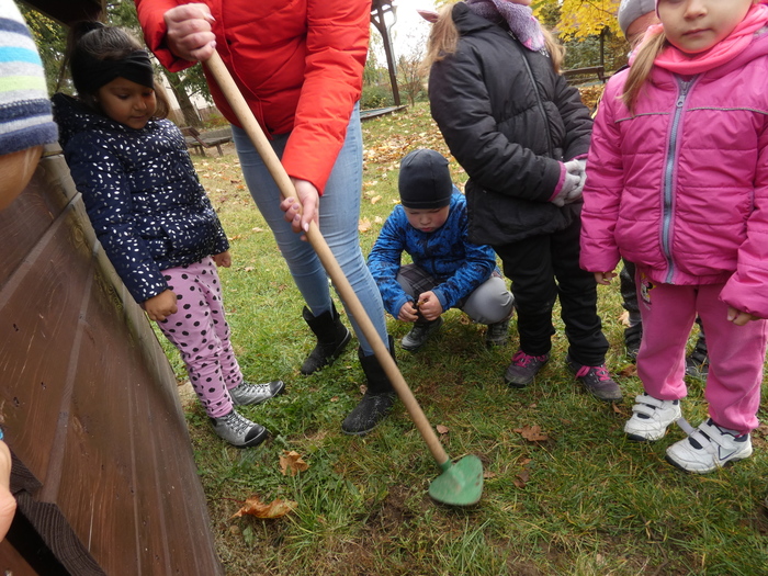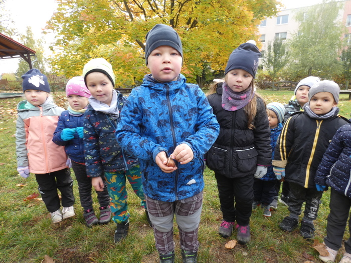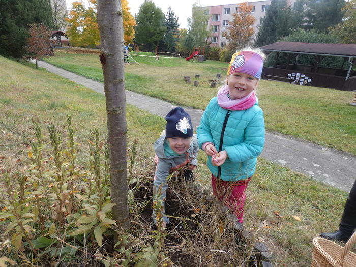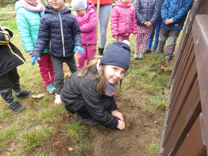 Malí zahradníčci pomáhali s vypletím vyvýšeného záhonu. S dětmi začínáme pozorovat krásně zbarvené listí stromů a keřů v zahradě. Drobným živočichům necháváme hromádku listí pro zimní odpočinek. Ježkovi jsme označili domeček, víme , že na zahradě přebývá. Snad se mu hromádka listí bude pro přezimování hodit. V říjnu také občas pršelo a zasetá travní semena na novém kopci se mají čile k světu.S dětmi jsme zasadili cibulky tulipánů v různých částech zahrady. Doufáme, že na nás na jaře vykouknou tulipánky ze země:-).