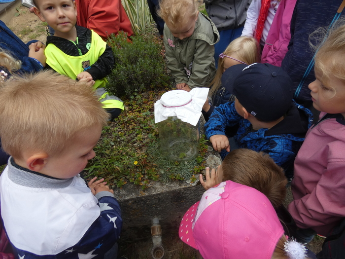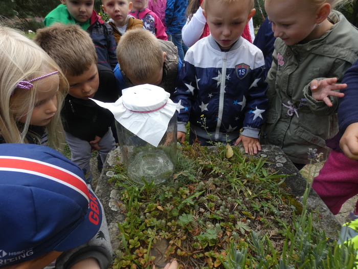 Na zahradě se objevila žabka rosnička - přísně chráněný druh. Děti si ji prohlédly ve velké zavařovací láhvi, mohly obdivovat.