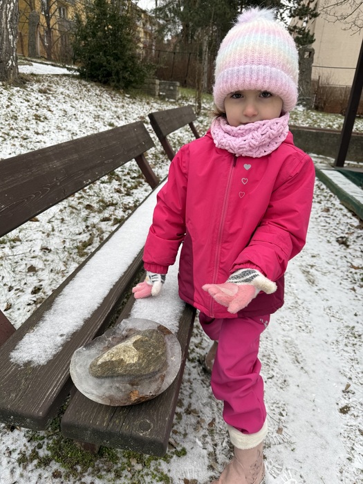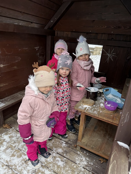 V pítkách pro hmyz a ptáky zamrzla voda, a vytvořila ledové ozdoby. Sníh v lednu nenapadl. Troška sněhu stačila dětem k hrám v přírodní kuchyńce.