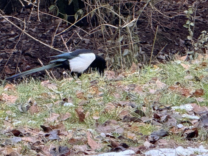 S dětmi jsme pozorovali Straku obecnou - vyklovávala nějaké pochoutky ze země.